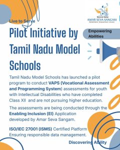 We are pleased to share an important milestone under a pilot initiative launched by Tamil Nadu Model Schools to strengthen post-school transition planning for youth with Intellectual Disabilities. As part of this initiative, young individuals who have completed Class XII but have not transitioned into higher education are being assessed using the VAPS (Vocational Assessment and Programming System) tool through the Enabling Inclusion (EI) Application developed by Amar Seva Sangam. EI App allows a structured and evidence-based framework for vocational profiling and informed career pathway development.